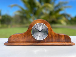 Koa mantel/desktop clock with a silver analog (silent) clock face. Clock Insert has a rubber band gasket to securely hold the clock face in place. To remove, gently pull out and add battery It is powered by 1 AA battery (not included). Once the battery is in place, replace clock face.​​